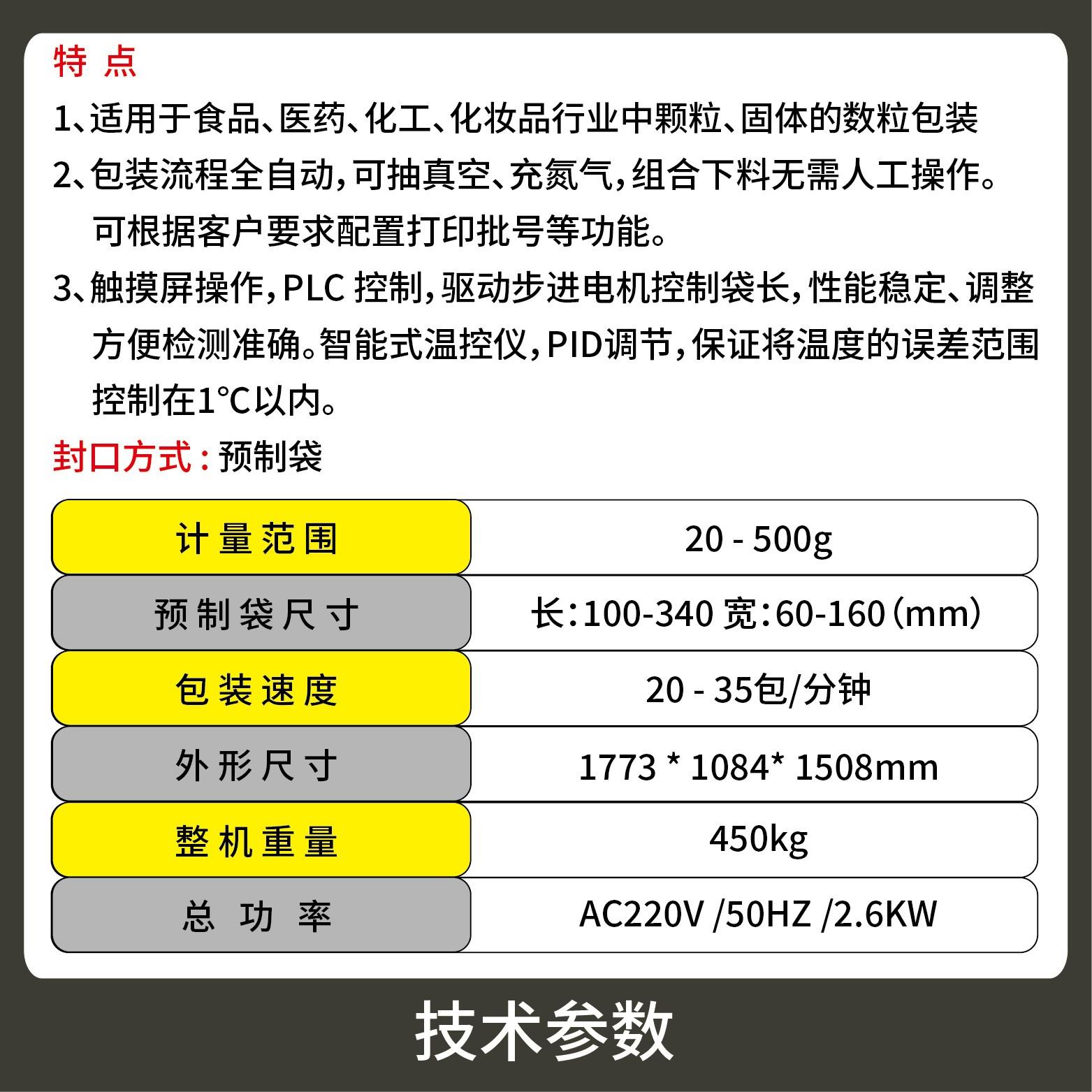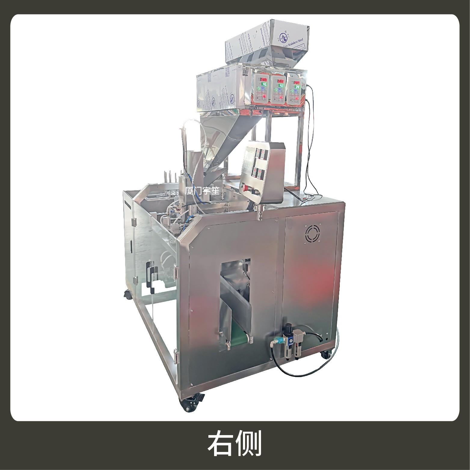 2、包裝流程全自動,無需人工操作,可抽真空、充氮氣,組合下料??筛鶕?jù)充填物料的性質(zhì)選配不同的下料結構,且可根據(jù)客戶要求配置打印批號等功能。